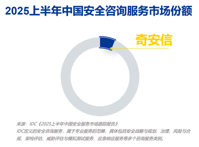日前,国际数据公司IDC发布《2025上半年中国安全服务市场跟踪报告》。报告显示,2025上半年中国安全咨询服务市场整体呈现下行趋势,而奇安信安全咨询服务凭借深厚实力持续领跑,已连续六年位居该市场份额第一,展现出强劲的领先优势和市场韧性。